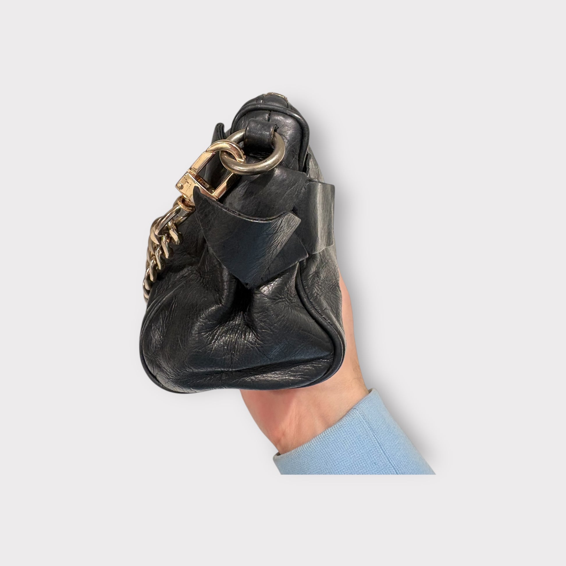 📌 Marque : Miu Miu 📌 Modèle / Référence : Mini sac porté épaule / bandoulière en cuir avec chaîne 📌 État : Bon état (vintage) 📌 Couleur : Noir 📌 Taille / Dimensions (env.) : • Hauteur : 14–15 cm • Largeur : 22–24 cm • Profondeur : 7-9 cm 📌 Matériaux : Cuir noir souple, chaîne métal doré, finitions dorées ✨ Description : Mini sac Miu Miu en cuir noir souple, au format compact et élégant. Il est doté d’une bandoulière chaîne dorée et de détails en cuir noué sur les côtés, apportant une touche féminine et raffinée. Son format est idéal pour transporter l’essentiel (téléphone, cartes, clés, rouge à lèvres) tout en conservant une allure chic, de jour comme de nuit.