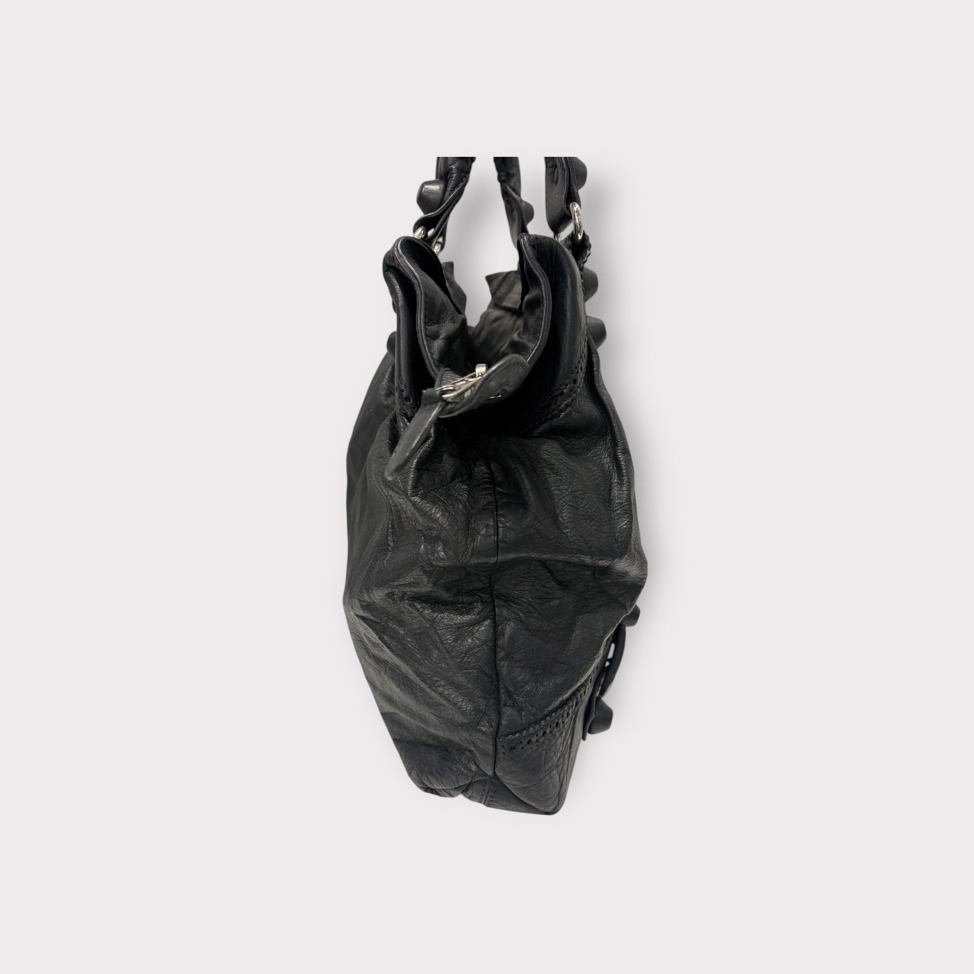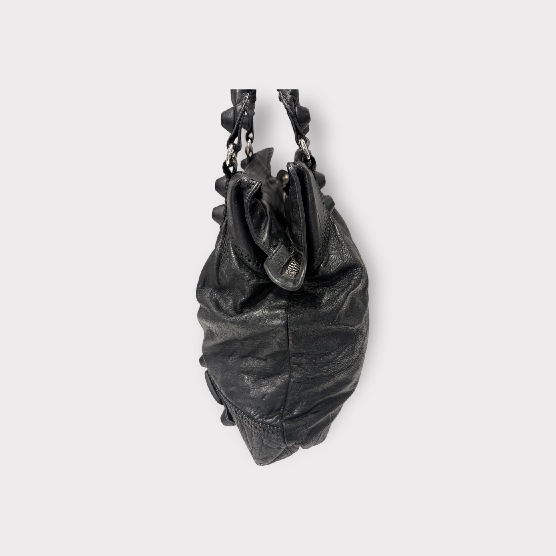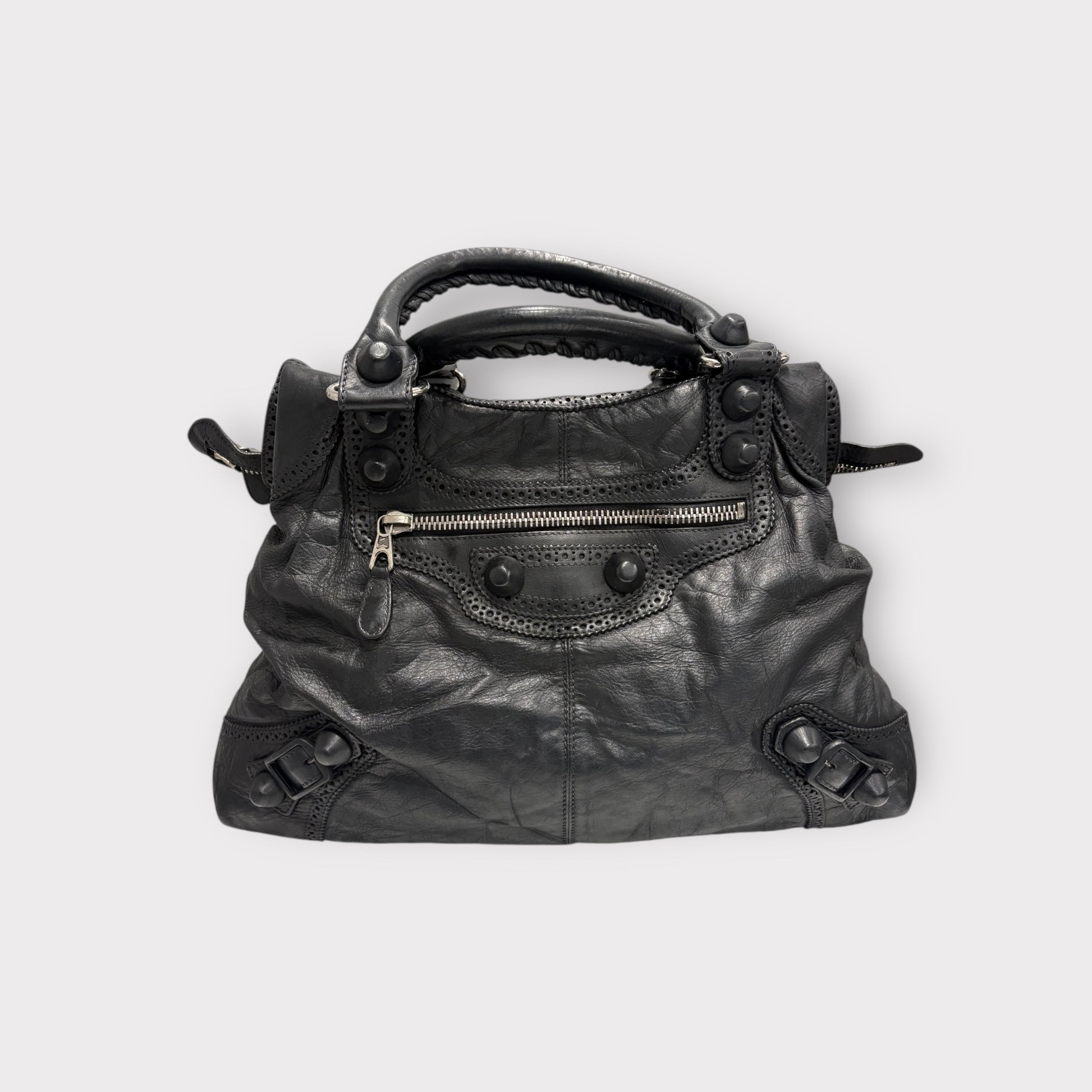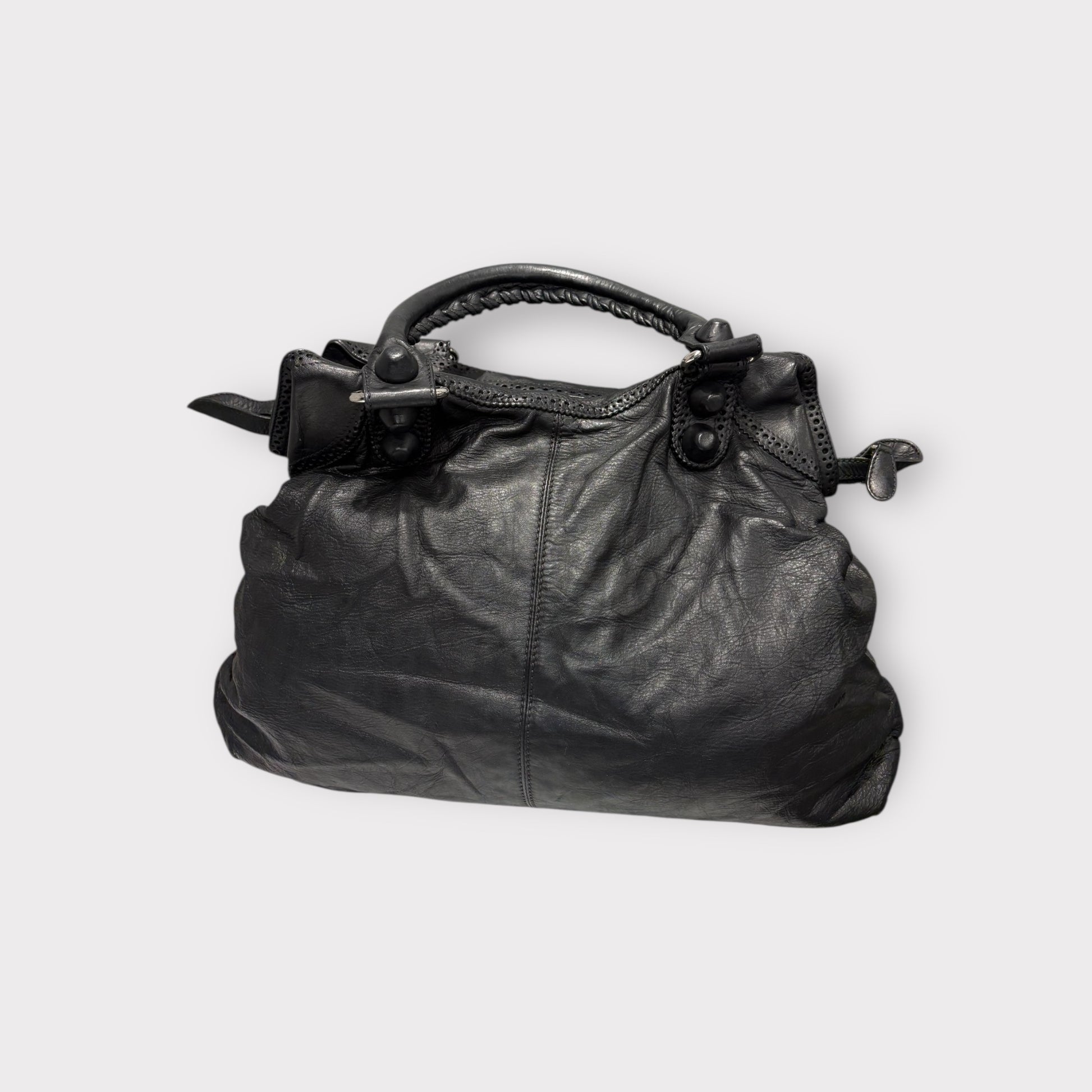 đ Marque : Balenciaga đ ModĂšle / RĂ©fĂ©rence : City / Classic City (sac Ă main iconique) đ Ătat : Bon Ă©tat (vintage) đ Couleur : Noir đ Taille / Dimensions (env.) : âą Hauteur : 24â25 cm âą Largeur : 36â38 cm âą Profondeur : 13â15 cm đ MatĂ©riaux : Cuir dâagneau souple, finitions mĂ©tal vieilli  ⚠Description : Sac Balenciaga City en cuir noir souple, reconnaissable Ă son design iconique avec poignĂ©es tressĂ©es, clous dĂ©coratifs et poche frontale zippĂ©e. ModĂšle intemporel trĂšs apprĂ©ciĂ© pour son look Ă la fois rock et chic. Format idĂ©al pour un usage quotidien, permettant de transporter facilement portefeuille, tĂ©lĂ©phone, maquillage et autres essentiels.  đ Ătat dĂ©taillĂ© : Article vintage prĂ©sentant des traces dâusage visibles et cohĂ©rentes avec lâĂąge : cuir naturellement patinĂ© et lĂ©gĂšrement froissĂ©, marques lĂ©gĂšres sur les angles et la surface. Les fermetures Ă©clair sont fonctionnelles, poignĂ©es en bon Ă©tat structurel. Lâensemble reste solide et esthĂ©tique. Voir photos pour plus de dĂ©tails.